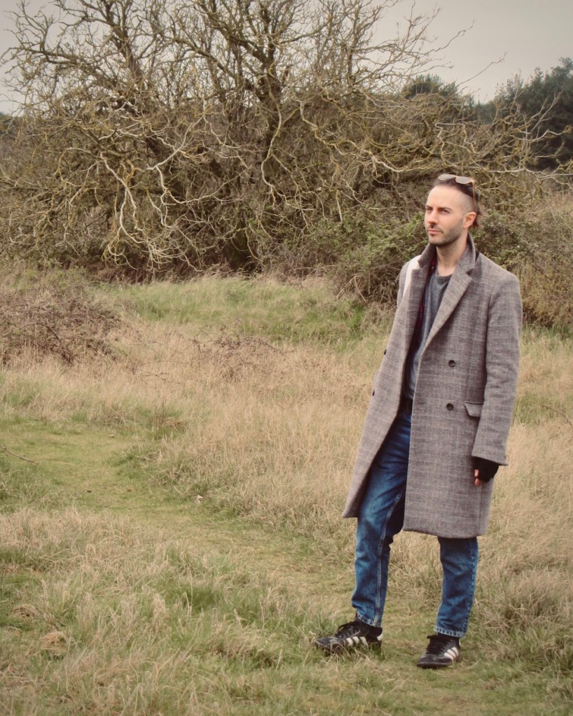 Anything else? Thank you for visiting my web site. Here is a photo of me in a big coat, looking pensive next to some brambles. I am slightly out of focus.